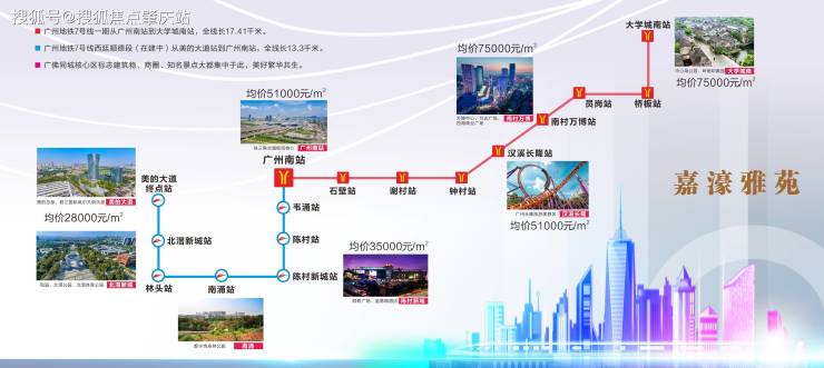 1. 地铁路网:广州地铁7号线起点站由大学城南至美的大道全方位无缝连接广佛 嘉豪雅苑就在南涌站,5站到广州南、8站到长隆30分钟到珠江新城 佛山地铁3号线无缝连接佛山五区,可换乘2号线和广州7号线。