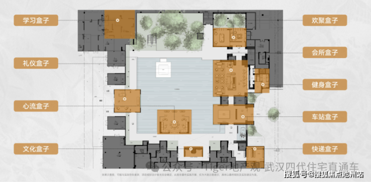 湖北科投|万科·光谷锦上围绕中央庭院,打造了礼仪盒子、心流盒子、会所盒子、欢聚盒子等九大功能盒子。