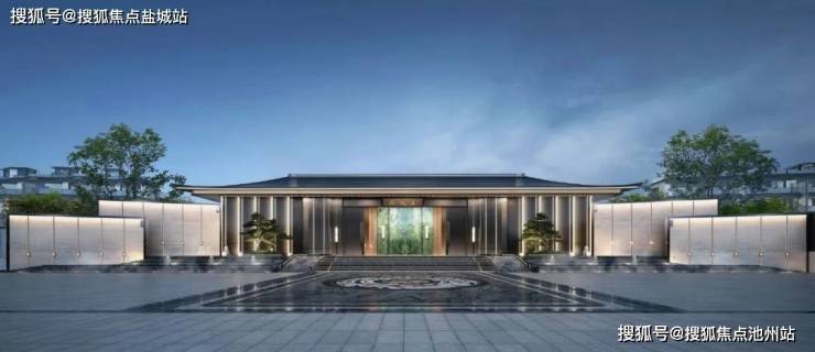 项目整体抬高约2米,南侧是一座宽约70米的主入口,约40米面宽的大门被庑殿顶所覆盖。依照古代府邸设计,大门左右两处叠水松景,整体素雅大气。