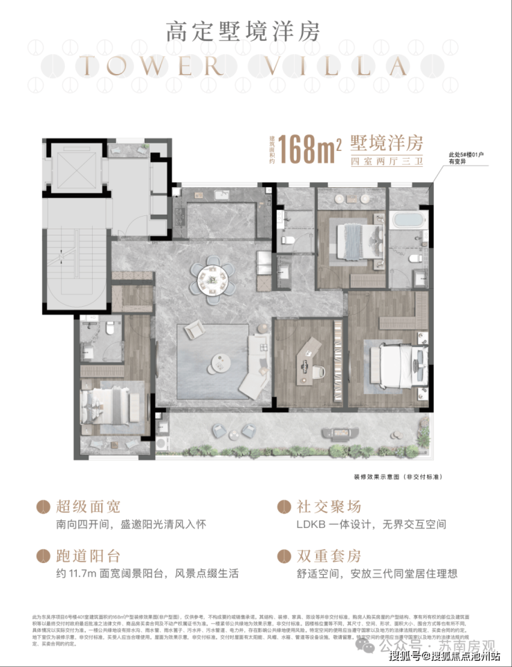 做到了南向三面宽、约9.7-11.1米尺度,进深约7.8米,大开间短进深的空间设计,超越市场大多数联排墅的空间格局;约245㎡联排边户约11.1米的面宽,几乎等同市面上300㎡面积段墅类产品的面宽极限值;首层局部约6.55米挑高大横厅,形成超大LDKG一体空间,足以容纳多种社交互动需求。