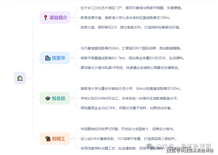 华润半山悦景位于重庆九龙半岛核心,紧邻万象城商圈和18号线地铁,教育资源优质(谢家湾小学),项目主打低密度住宅,容积率2.0,绿化率30%,户型121-139㎡,配套成熟,交通便捷,定位高端圈层,由华润置地开发,物业为华润物业。现房销售,稀缺主城地块,未来增值潜力大。