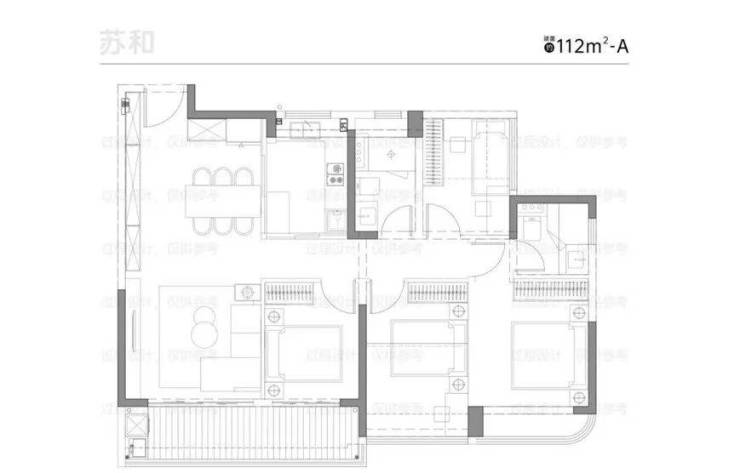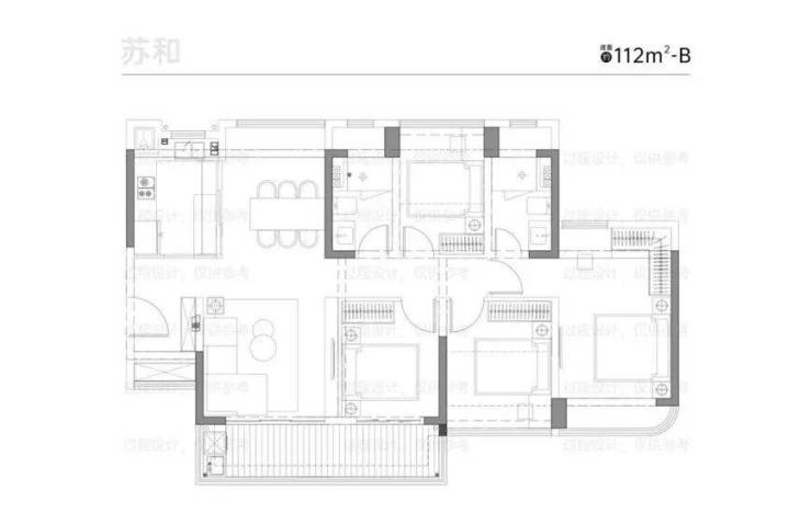 约112平的四房A户型,整体格局有点像约87平户型的放大版。
