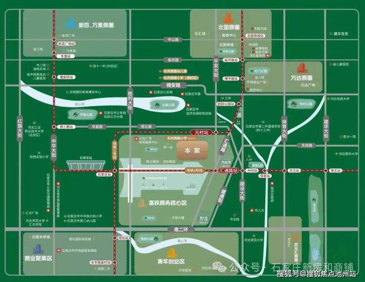 万象城/新百、北国未来城、裕华万达、西美四大商圈环伺周边;约27万㎡万达茂(建设中),超五星文华酒店(建设中),约2万㎡社区商业(规划中)