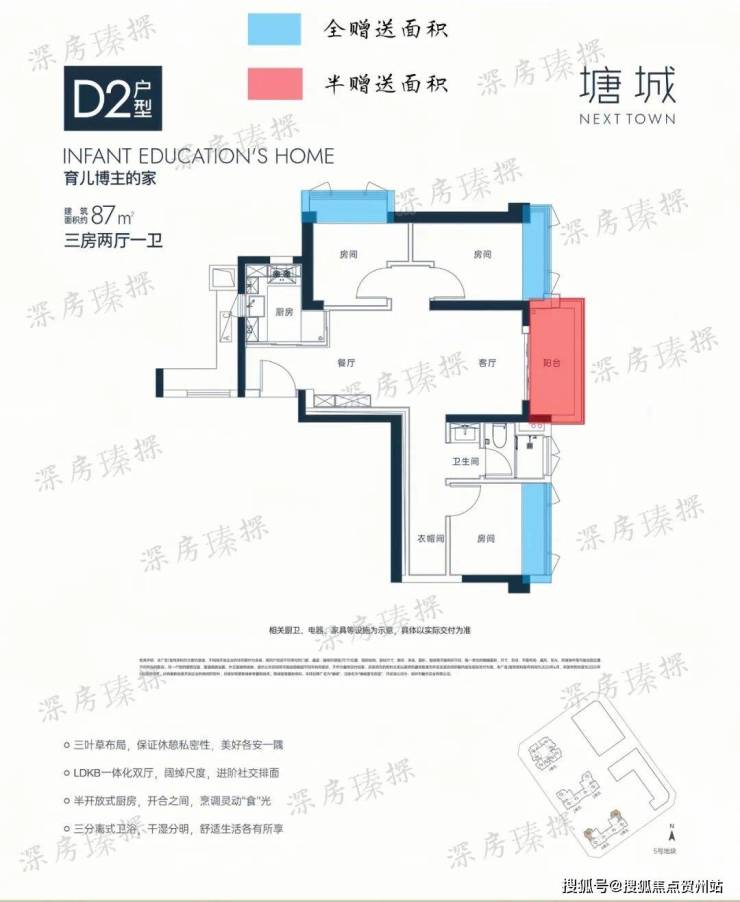 87㎡的3房2厅1卫,D2户型,5栋4/5单元03户型,设计的是竖厅三叶草格局,进门入户玄关,客厅3.3米开间,LDKB一体化设计,半开放式厨房,卫生间三段式干湿分离,得房率约80%(包含赠送),东北或西南朝向。