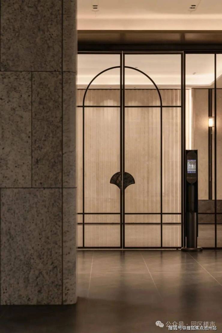 美学之外,匠心于内。蜂窝铝板与印度白玫瑰石材干挂立面,从建筑外部一体延伸至架空层内部,柔和了空间的边界,重点部位则以石材拉槽精准搭配金属线条。以美学的一体化设计,在光影流转间,营造出极具仪式感与尊贵感的归家序厅。