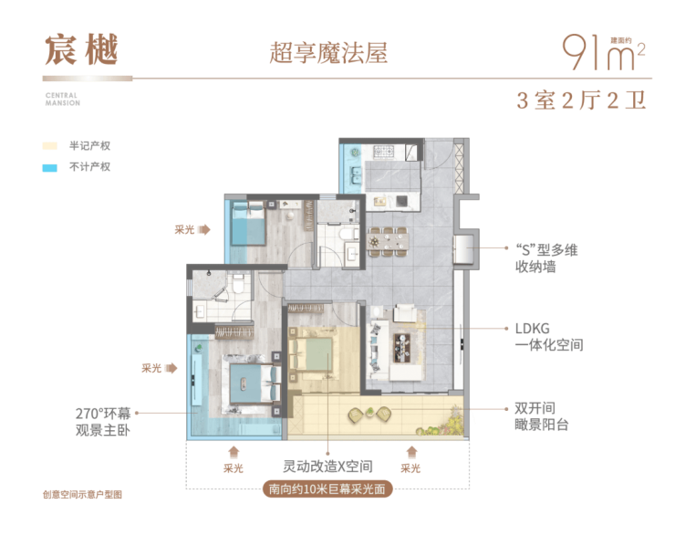 建面约91㎡3房2厅2卫,格局方正实用,动静分区,高达约99%的使用率让空间更显宽阔舒适,满足一家三口的阳光生活。