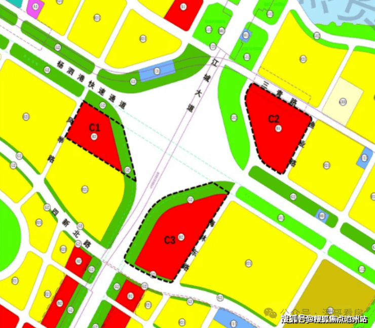 将三村产业用地由9.79公顷商务用地、4.57公顷商业用地调整为12.76 公顷二类居住用地、1.6公顷中小学用地(九年一贯制学校),为保障学校和居民交通出行,C1地块设置1条6米宽环形公共通道,两端连接凤举路。)