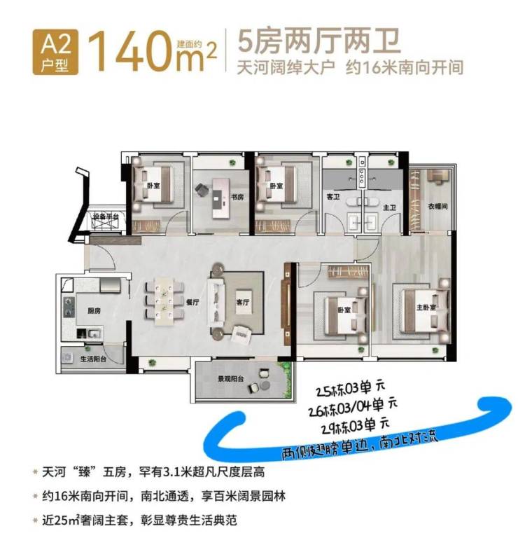 194㎡五房2厅4卫(南北对流)奢阔五房大平层,双景观阳台南北通透,观景生活两不误。