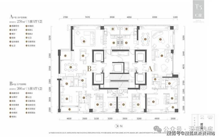 T3栋为266平和270平3房3厅3卫户型