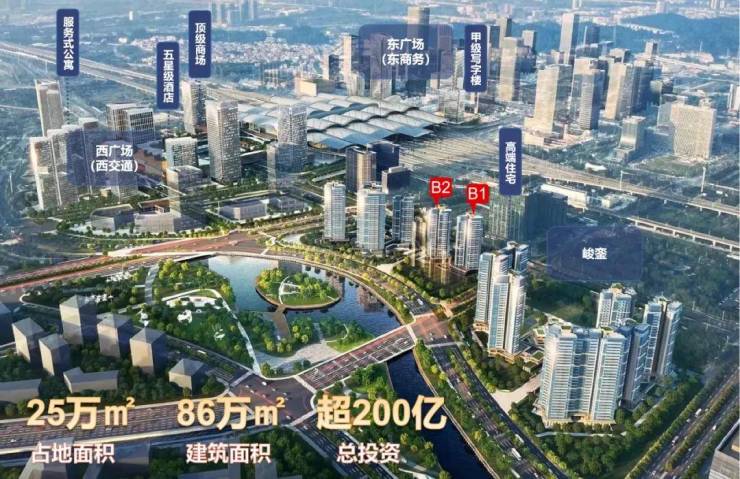 项目介绍:总用地面积约为25.1万㎡,总建面约86万㎡,总投资超200亿