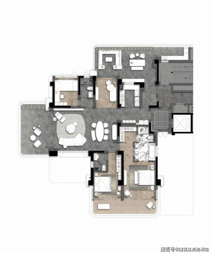 通过十字洄游设计,把空中花园作为“第二会客厅”,减少户内空间进入频次和干扰,强化奢宅私密体验。
