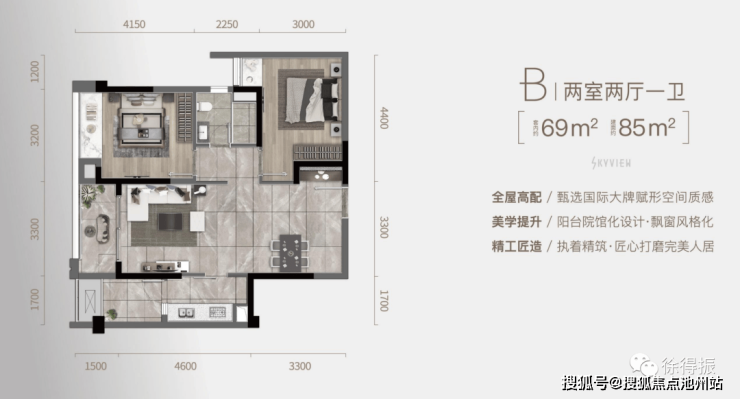 两室两厅1卫:建面约85.83㎡,套内约69.09㎡,总价180-230W