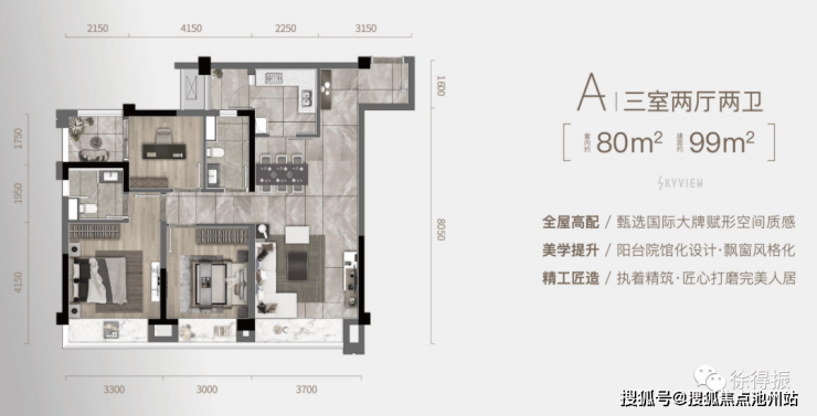A户型:三房两室2卫:建面约99㎡,套内约80.26㎡,总价230-270W