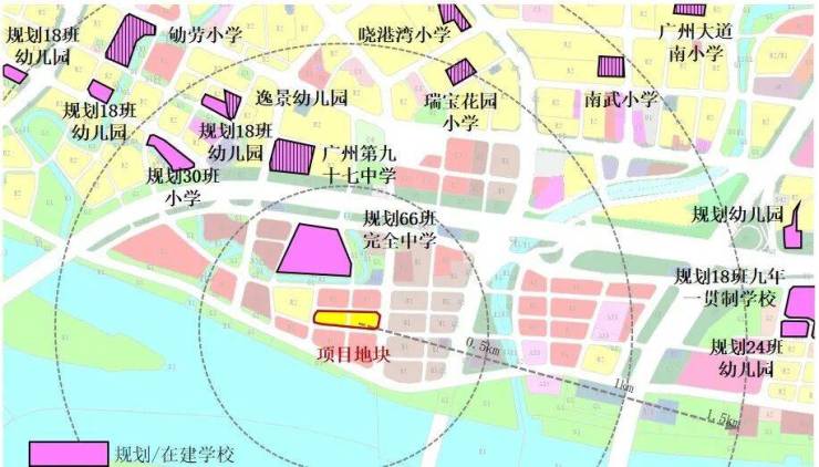 1千米范围内有广州第九十七中学,1.5千米范围内有南武小学等,距离地块