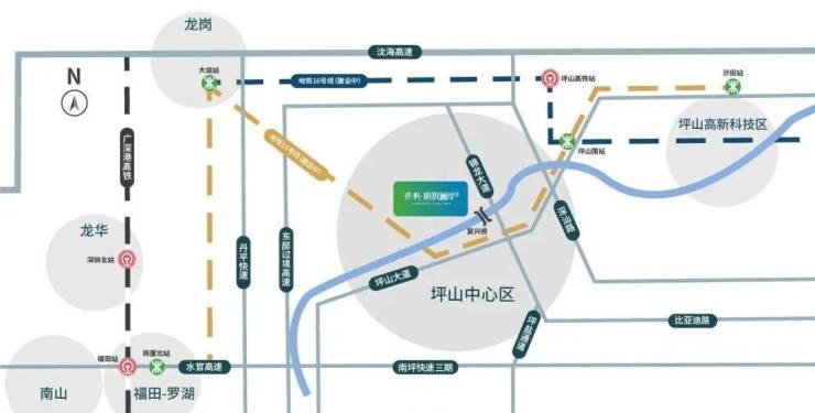 保利明玥澜岸花园位于坪山区碧岭街道沙湖社区新龙路(规划龙勤路)与规划复兴路交会处南侧。