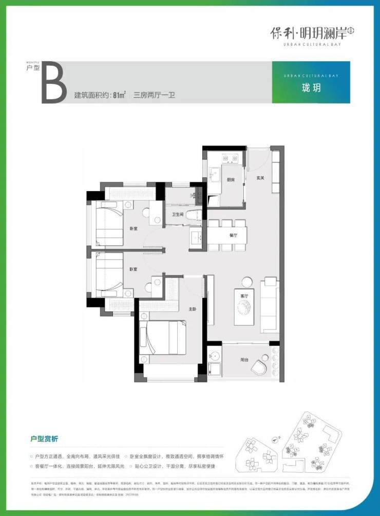 81㎡的3房2厅1卫,设计的是竖厅格局,客厅3.4米开间,LDKB一体化设计,进门独户玄关,动静分区,U型厨房,卫生间三段式分离,得房率:75.6%(不含赠送),阳台有西南向、东南朝向或朝西向