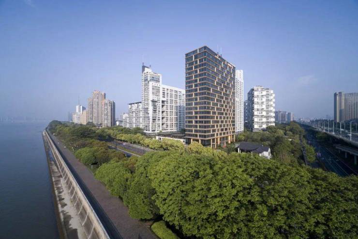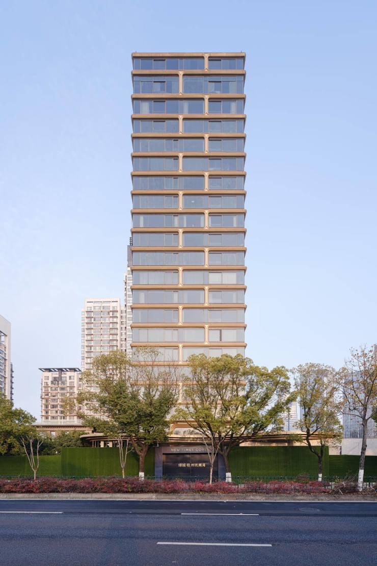由line+建筑事务所孟凡浩操刀,外立面采用玫瑰金铝板曲面线条,三层中空LOW-E玻璃幕墙(最大单扇3.6米),抽象钱塘潮水动态美学。
