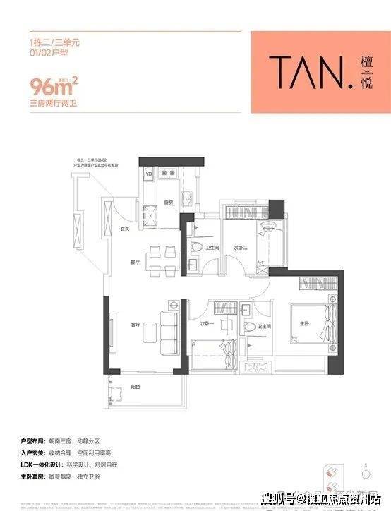 建面约95-96㎡三房两厅两卫