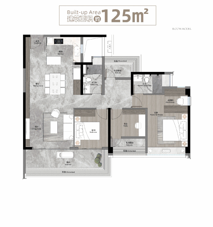 建面约125㎡户型,则是天河舒适改善的新标杆。公区采用LDKG一体化设计,可以打造尺度阔绰的大方厅,给到家庭生活更多的想象空间。在主卧中,还特别配置了一处步入式阳光衣帽间。每天早晨,业主就可以阳光的沐浴下,梳妆打扮,精心穿着。