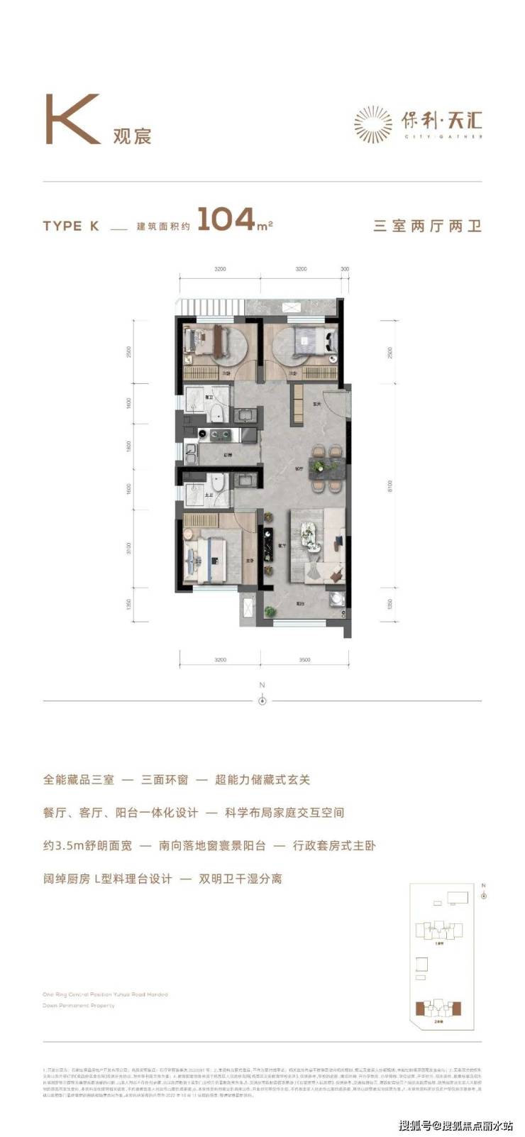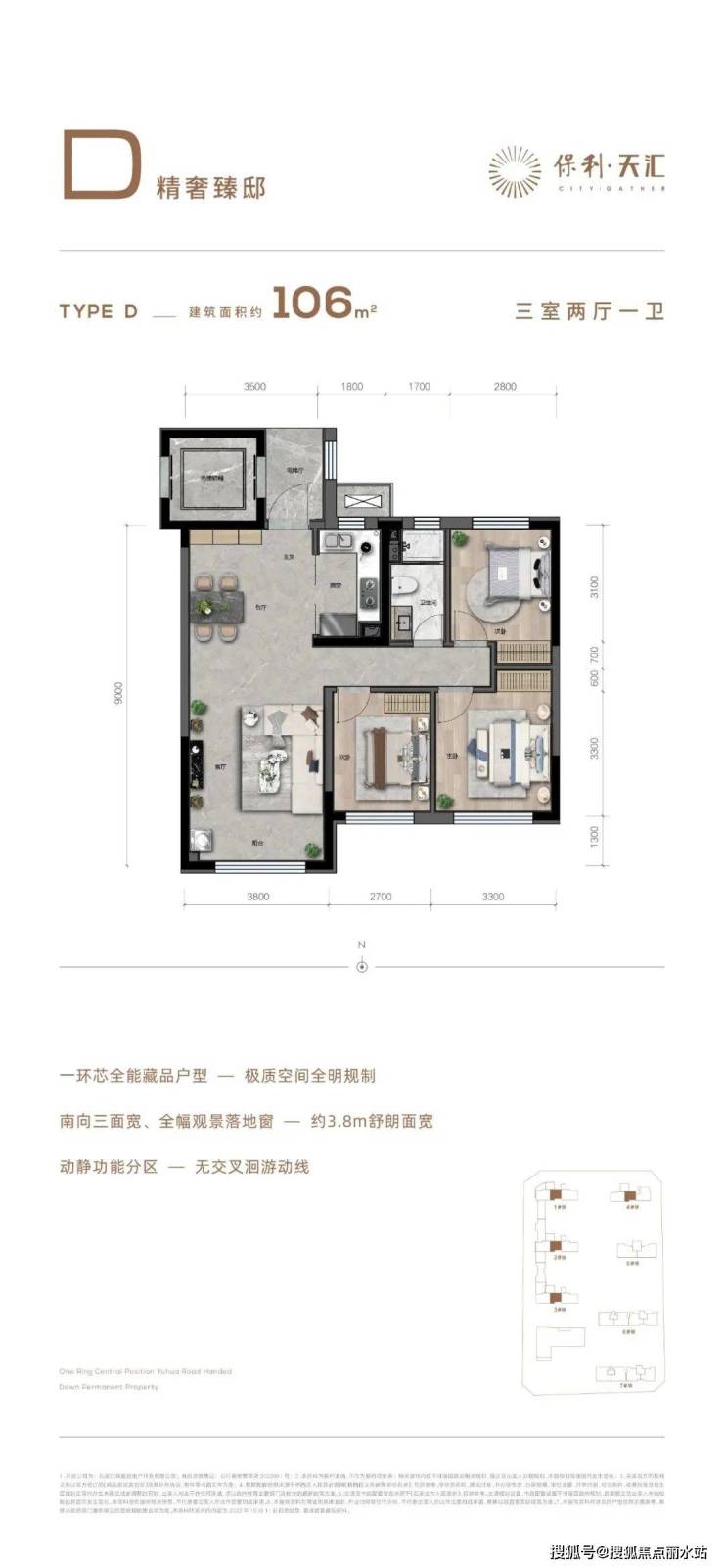 户型亮点:南北通透、全明三室两厅两卫、独立玄关、明厨明卫、干湿分离、1.35米进深阳台。