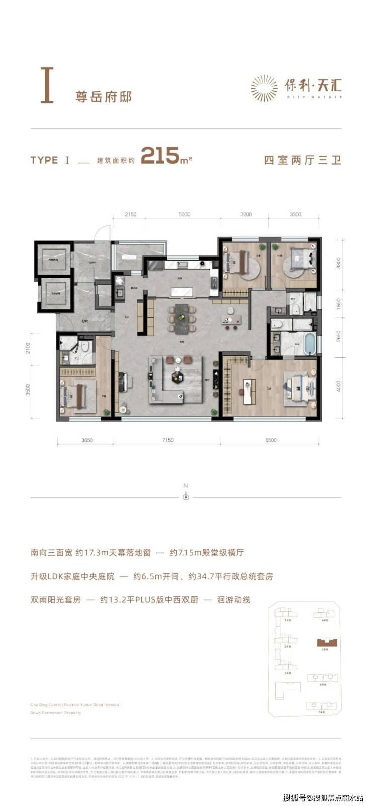 (3)产品亮点:3.15米层高,私享电梯厅、独立玄关、7.15m宽厅、17.3m南向落地窗极致面宽、13.2m开间中西双厨、6.5m(约35平)总统套主卧、南向双套房、独立家政间、设备平台全赠送。