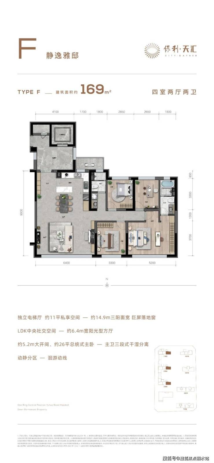 私享电梯厅、6.4米宽厅、二环里唯一5.2米开间总统套主卧、全明三阳、设备平台赠送。