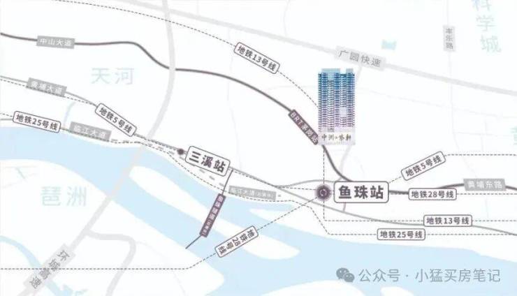 地处黄埔茅岗板块,这个位置可是鱼珠临港经济区和广州国际金融城交汇的关键节点 。项目距离地铁 5 号线和 13 号线的鱼珠站仅 400 米左右,步行大约 8 分钟就能抵达。通过这两条地铁线路,一站就能直达天河,两站可到琶洲,日常通勤十分便捷。