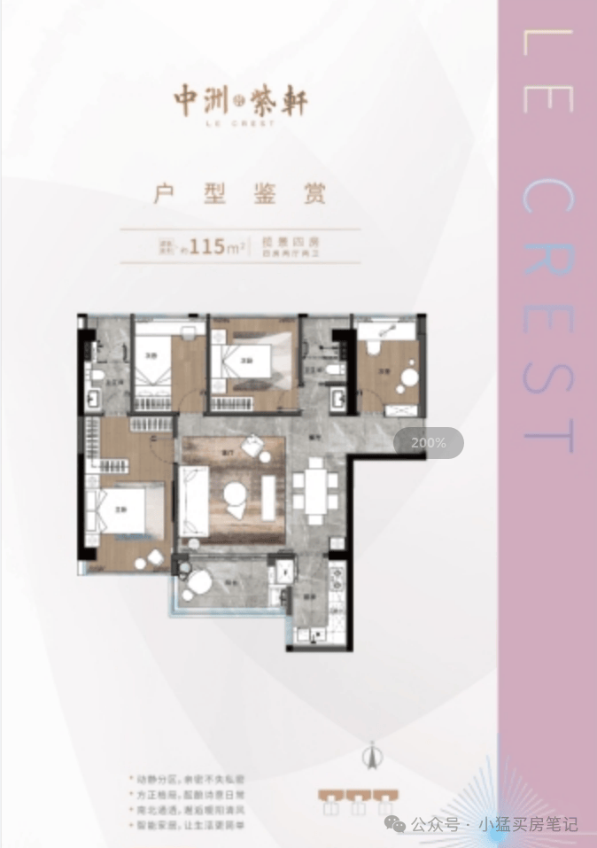 还有建面约 110 - 115㎡的四房两厅两卫户型,适合家庭成员较多,比如有老人帮忙带孩子,或者需要一个独立书房的家庭。该户型做到了南北通透,全明格局,客厅连接着阳台,采光和通风效果都不错。公共卫生间做了干湿分离,使用起来更加方便。而且多出来的一个房间,可以根据家庭的实际需求灵活改造,实用性很强。