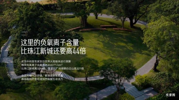 背靠约243万㎡原生山林,环抱约5.3万㎡日月双湖,实测负氧离子浓度超珠江新城44倍、白云山11倍。