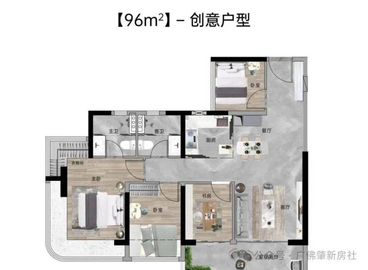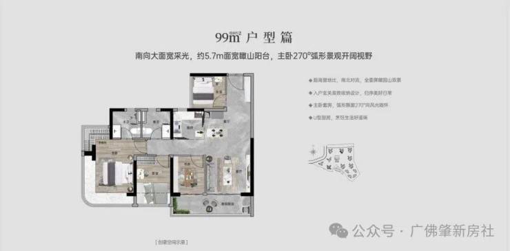 【96㎡四房两厅两卫】:西南向,使用率100%,约5.7米面宽瞰山阳台,主卧270°主卧弧形玻璃幕窗。