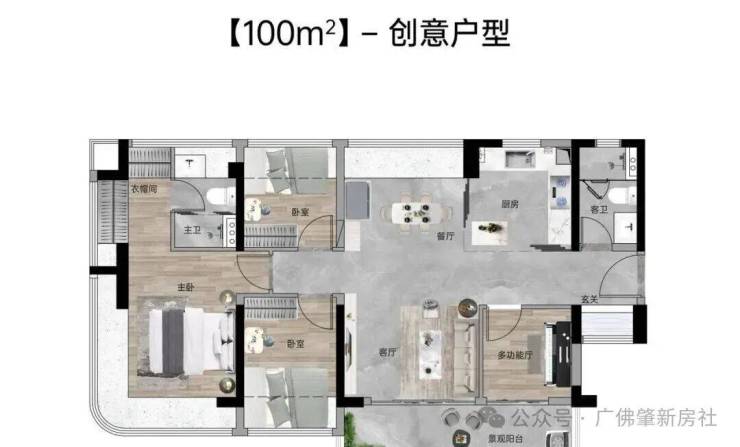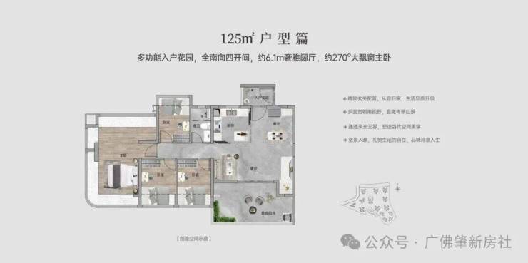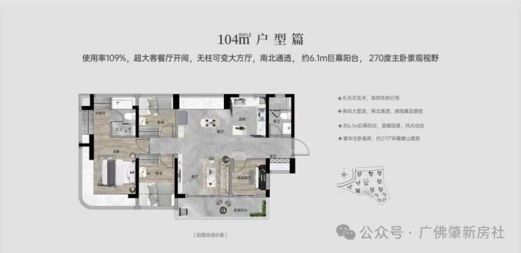 【100㎡四房两厅两卫】:西南向,使用率109%,南北通透,约6.1米巨幕阳台,主卧270°主卧弧形玻璃幕窗。