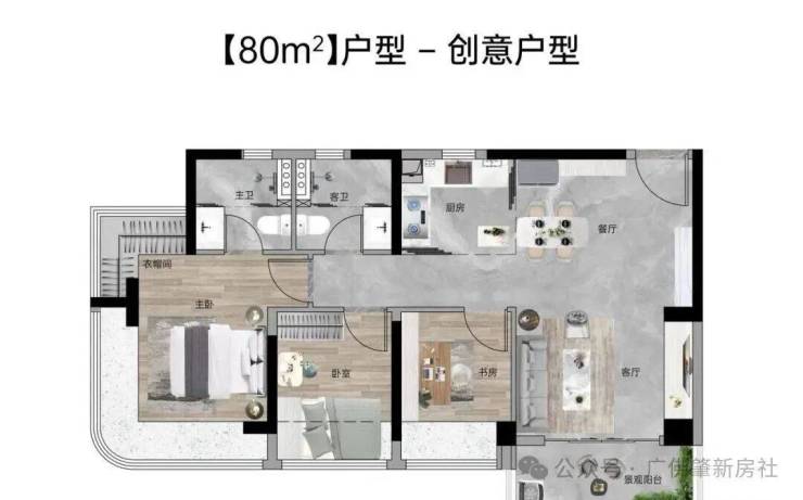 【80㎡三房2厅2卫】:东南向,使用率107%,四开间南向,12.6米超大面宽,主卧270°弧形玻璃幕窗。