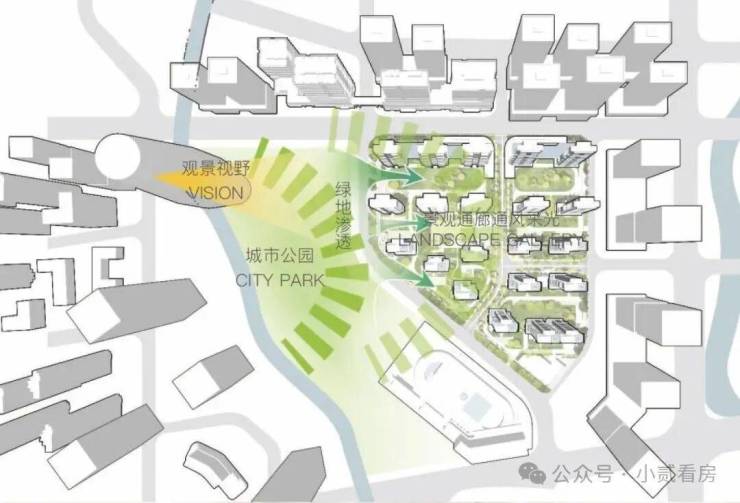 项目因地制宜,把小区西侧的城市公园视野引入社区,打造内院、外园的无界绿色视觉。