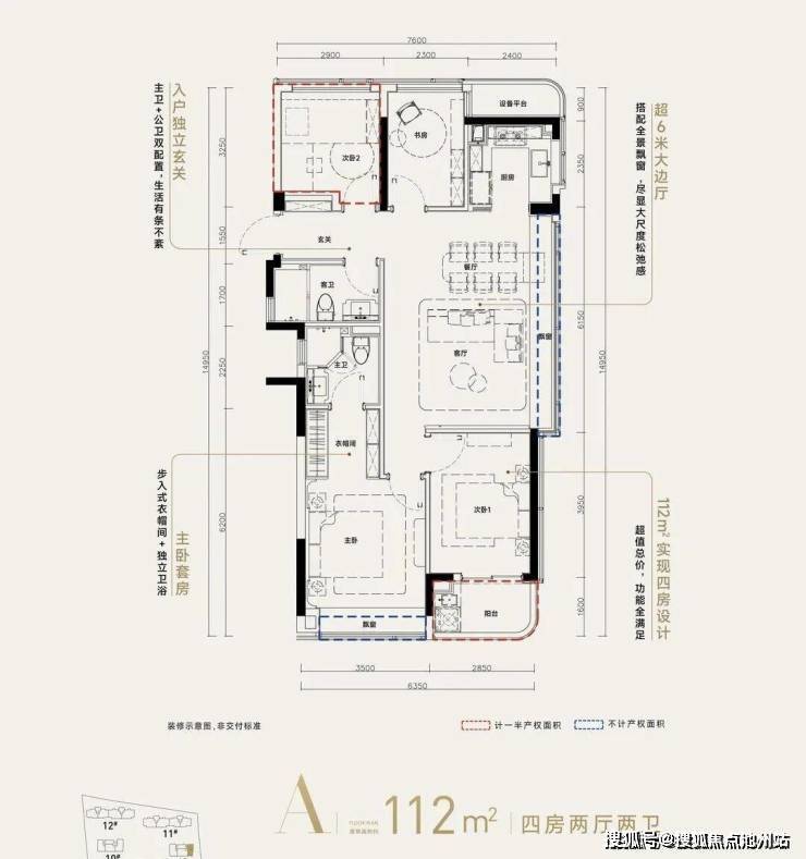 ❹高层建筑面积约112㎡户型,4房2厅2卫,含赠送得房率约92%。