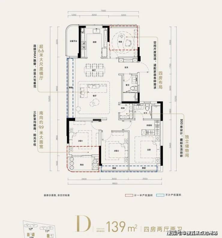 ❶高层建筑面积约139㎡户型,4房2厅2卫,含赠送得房率约92%。