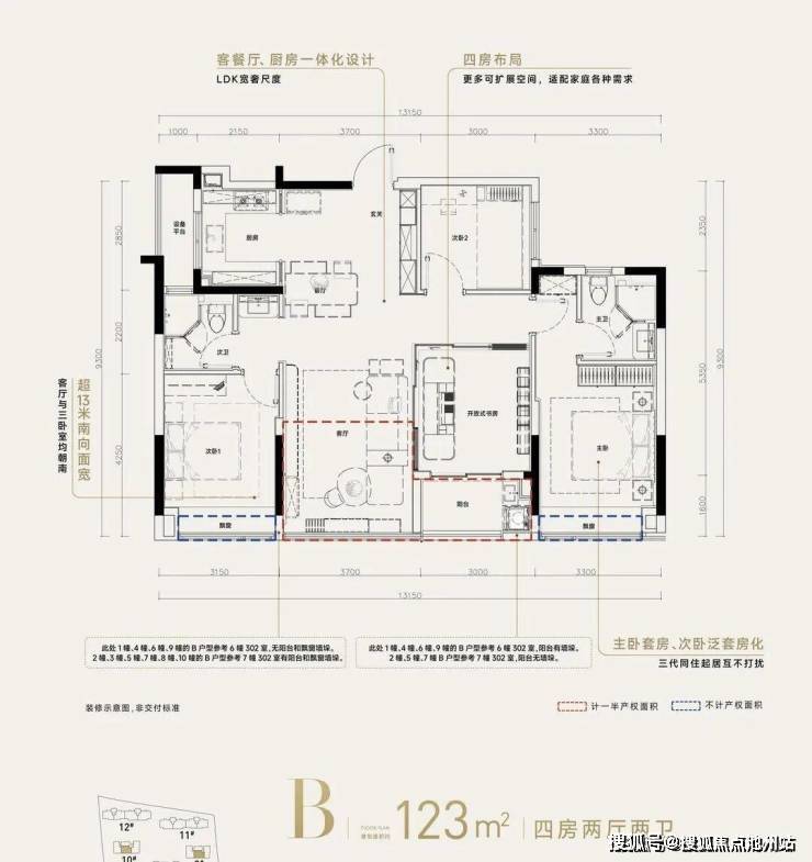 ❸高层建筑面积约123㎡户型,4房2厅2卫,含赠送得房率约90%。