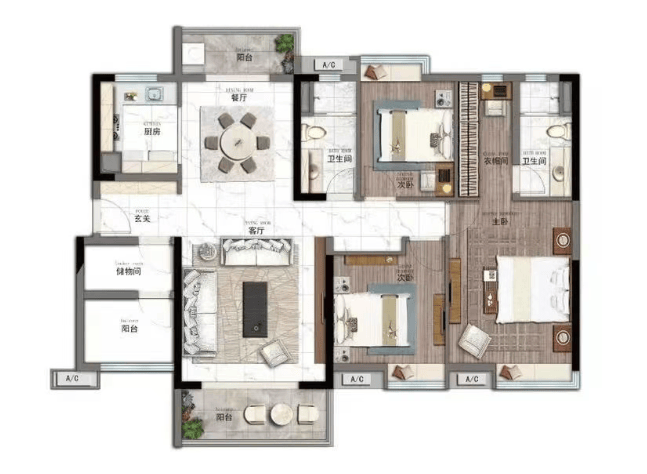 建面125㎡3+1房2厅2卫,南北对流双阳台,三房朝南全明格局。