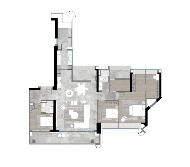 330㎡五房四卫:2梯1户设计,电梯前厅约20多㎡专属空间。约70㎡餐客厅整合客餐厨阳台空间,形成家庭核心区。主卧配置L型飘窗,拥揽270°环江巨幕景观。