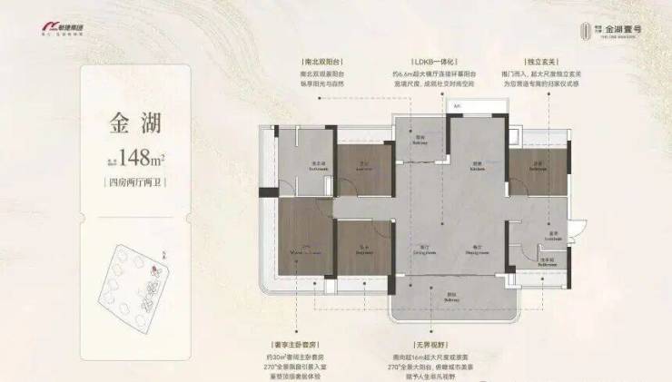 148-149㎡四房配备 LDKG 一体化设计,南向采光面可达约 16 米,部分房间能直接看到湖景,空间利用率较高。
