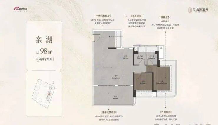 在售户型涵盖 四居室户型,98㎡四房单价与两居室相近,采用全南向设计,部分带有 270° 全景飘窗;