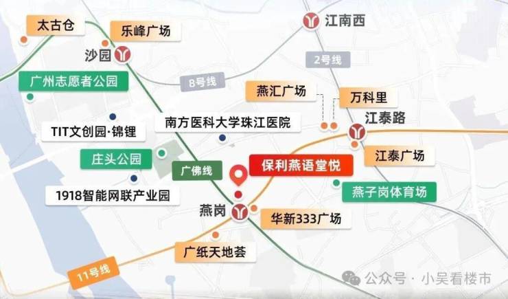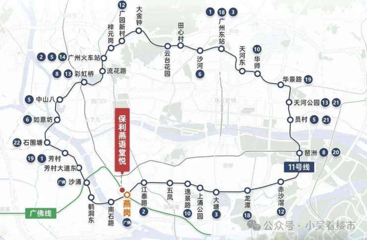 项目家门口就是地铁广佛线和11号线的交汇处燕岗站,算是标准的双地铁盘了,通过广佛线可转1、3号线,7个站可到珠江新城,11号线是广州首条大环线,该条线路能覆盖琶洲、金融城、天河公园、广州东、广州火车站和白鹅潭,而且,11号线还是彻底打通广州地铁线网的“换乘之王”,全线32个站点中,有26个为换乘站,16个与既有线路换乘,含金量,不言而喻,通勤属性非常高。
