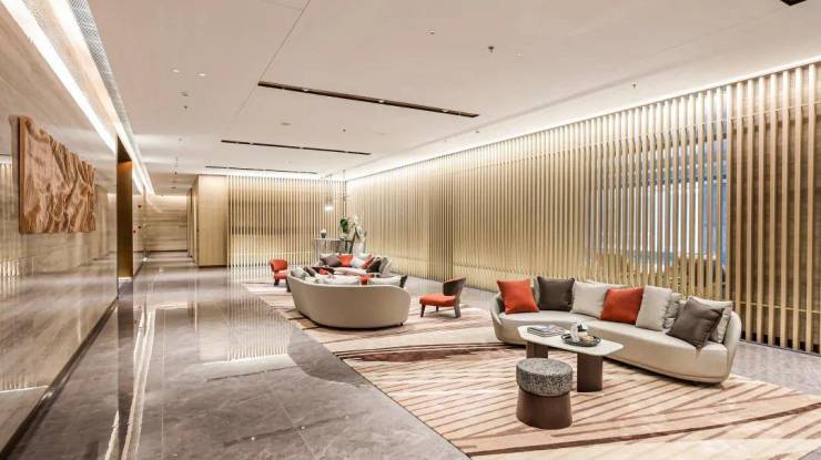 穿过林荫夹道,就来到了中心会客厅,沿着旋转楼梯可以直接通往庭院生活馆。