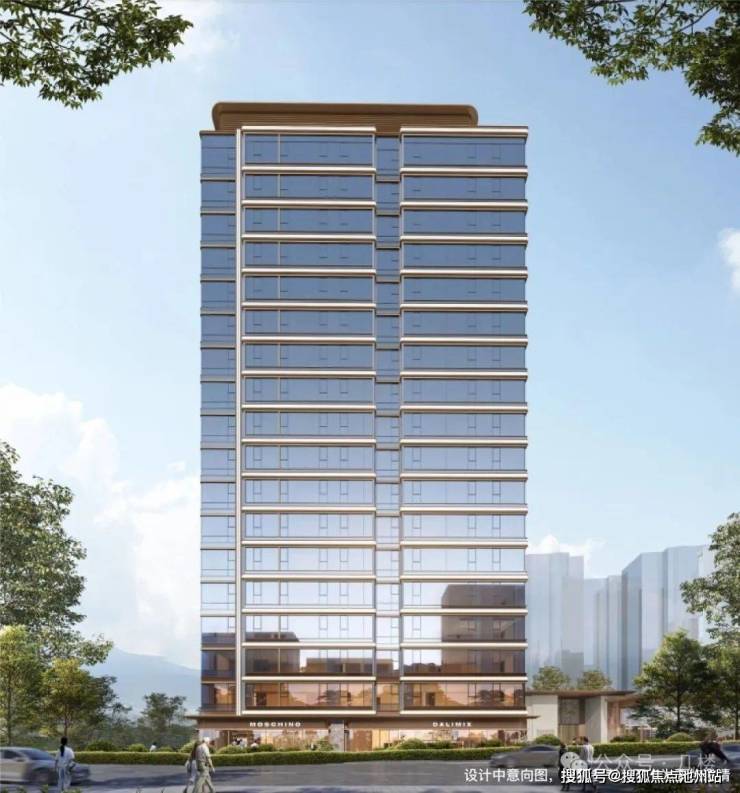 建筑外立面以白金配色为基调,楼顶塔冠采用金色铝板材质,大面积玻璃幕墙搭配局部铝板线条,简约精奢。