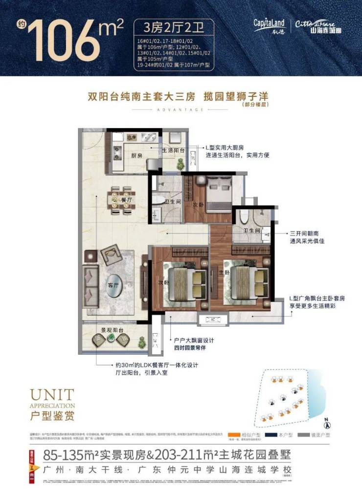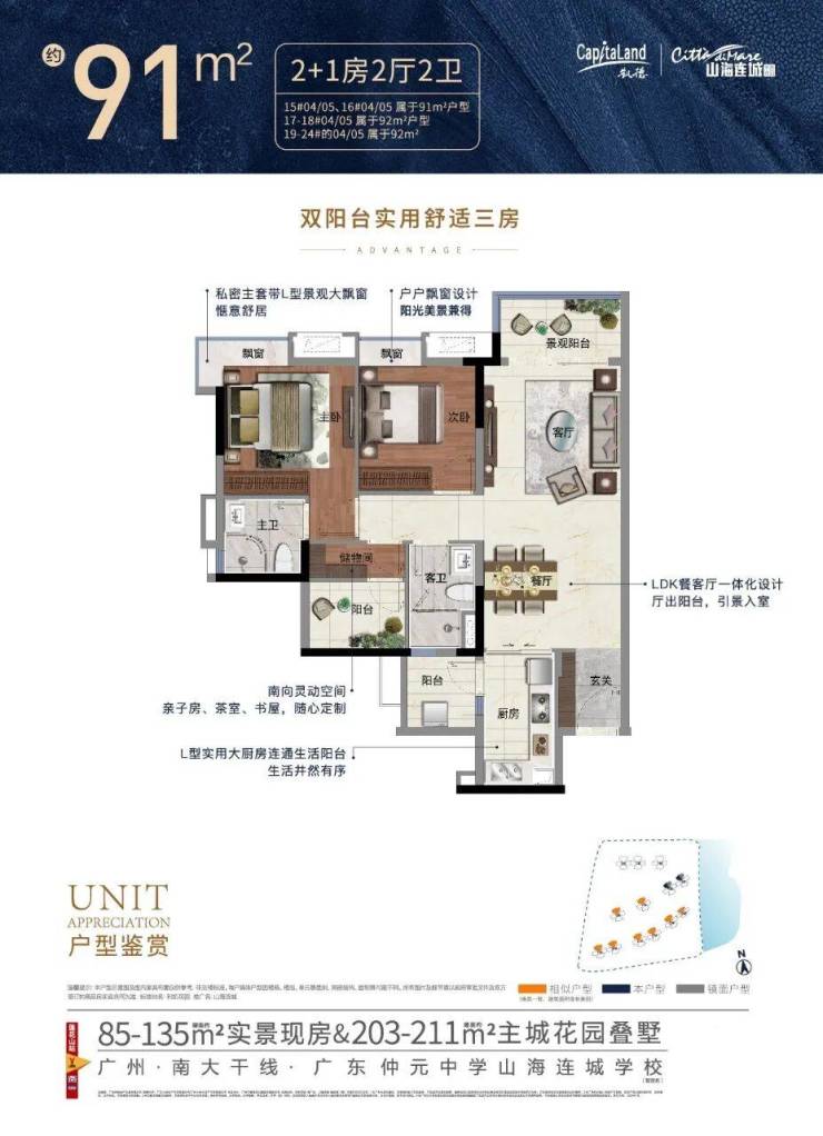 建面约92-131㎡三至四房,刚需改善置业优选。低密小高层,南向3开间,山海双景视野,全户型带主套,270度全景飘窗,美景尽收眼底。