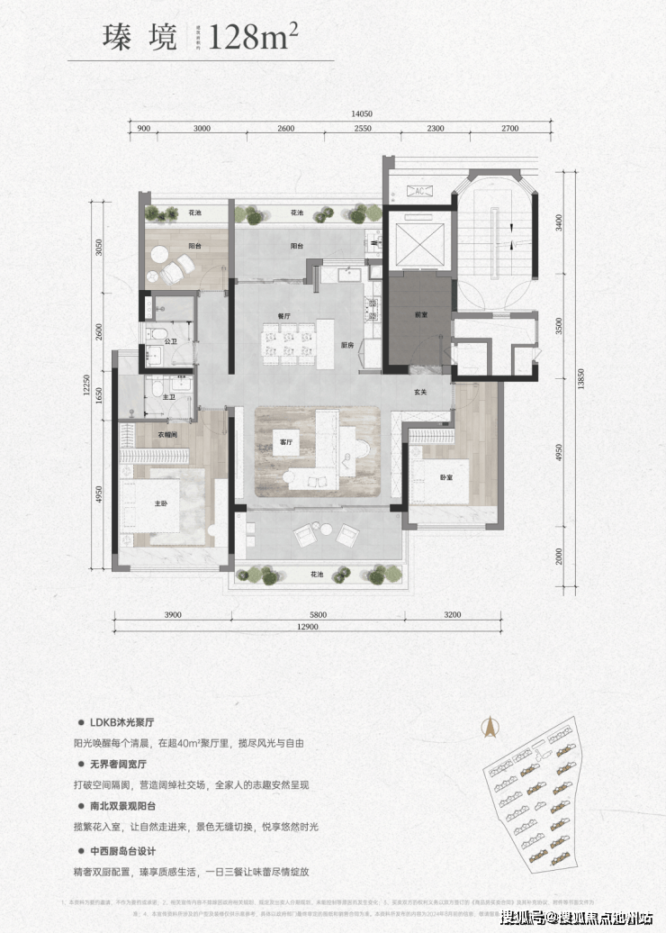 128㎡户型类独梯入户,约 7㎡的入户空间宽敞大气。餐客厅一体化设计,面宽约 5.8m 的超阔横厅,约 42㎡的多功能通厅,无论是家庭聚会还是朋友宴请,都能轻松应对。开放式厨房采用中西厨布局,增强了互动性。南向主卧套房约 24㎡,奢阔尺度搭配观景飘窗,独立卫浴设计,让业主尽享舒适与私密。南北双阳台将休闲与生活功能完美结合,三开间朝南的布局,让阳光洒满每一个角落。