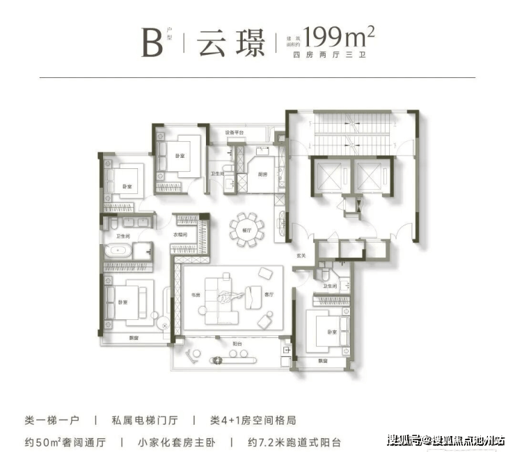 高层均为建面约199㎡的大平层户型,极致纯粹的业主圈层,带来更为尊贵的居住体验。其户型设计尽可能扩宽南向开间的同时,展现出了极为阔绰的空间尺度,足以满足多代同堂的居住需求,成为众多购房家庭终极改善的首选。