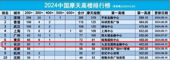 周知,长沙超高层地标很多,200米+地标数量居全国第七,在中部仅次于武汉;300米+地标仅次于深圳和广州,长沙高度,赫赫有名。