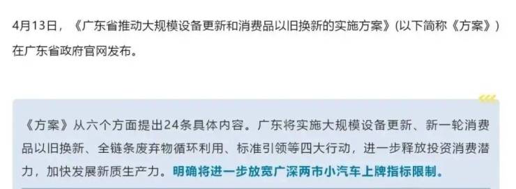 广东省最新方案表示,将进一步加快发展新质生产力,明确放宽广深两市小汽车上牌指标限制。