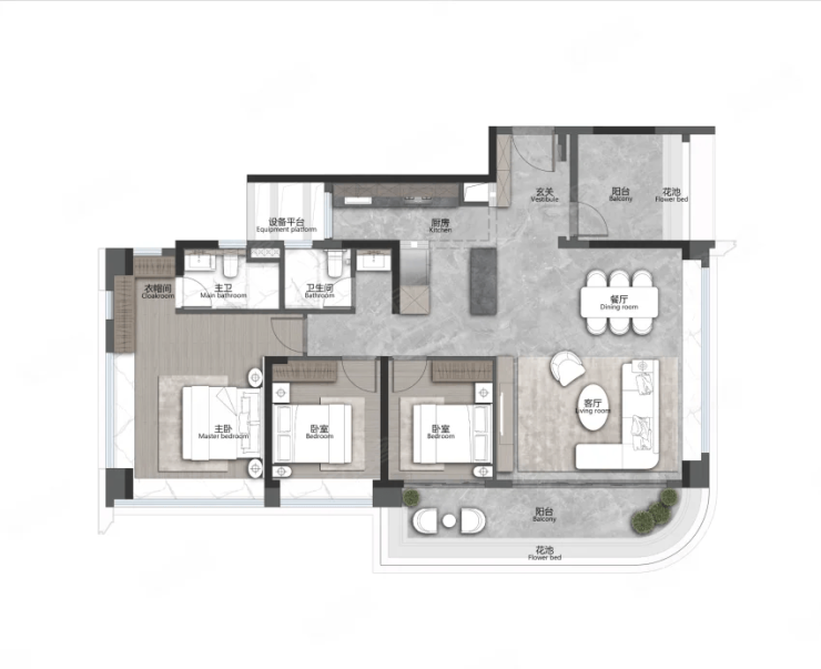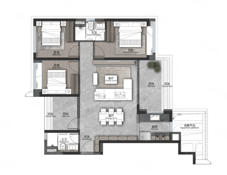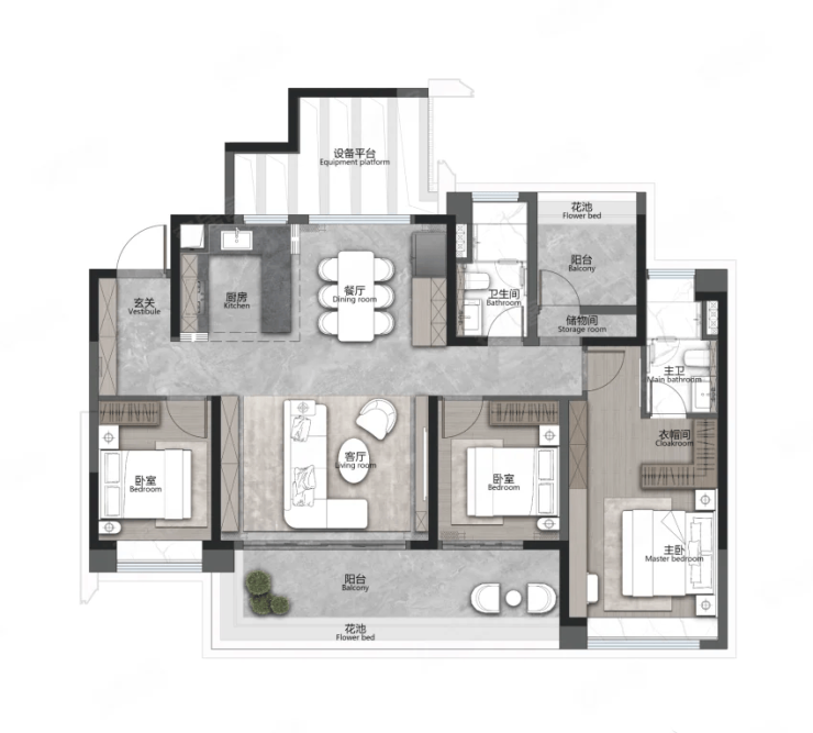 目前在售的户型覆盖刚需到改善需求,得房率超过 100%,每户还配备 5-8㎡的设备平台,相当于额外多出一间房。