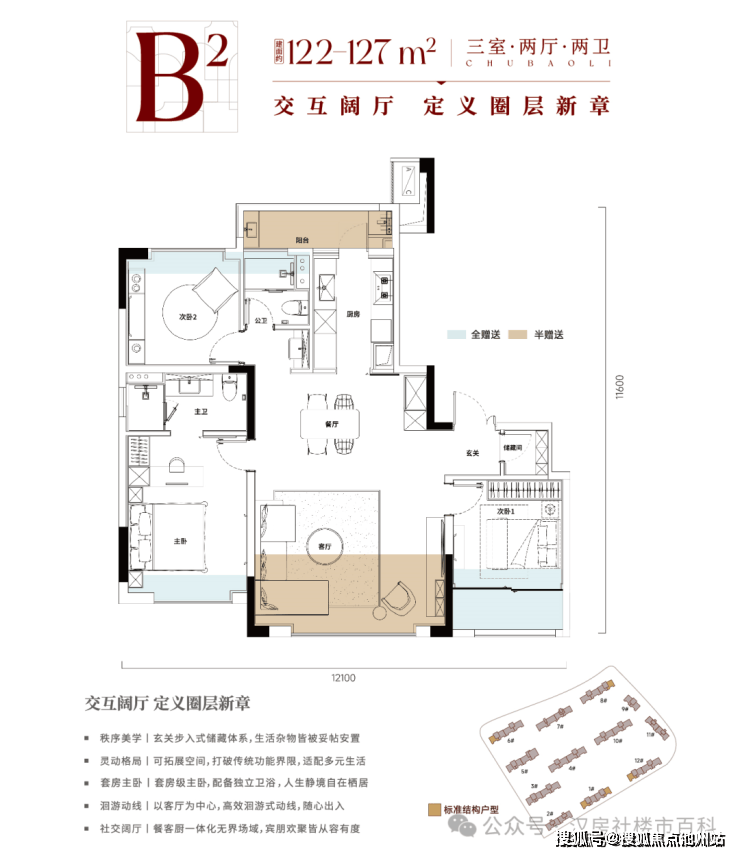 该户型位于1、6、8号楼及 12 号楼的边户,有独立的入户电梯厅,三开间朝南,入户门口新增了一个小型储物空间,且南北双阳台布局,增加了房间的通透性,全屋赠送面积很大,120m²左右可以满足刚需改善型的需求。